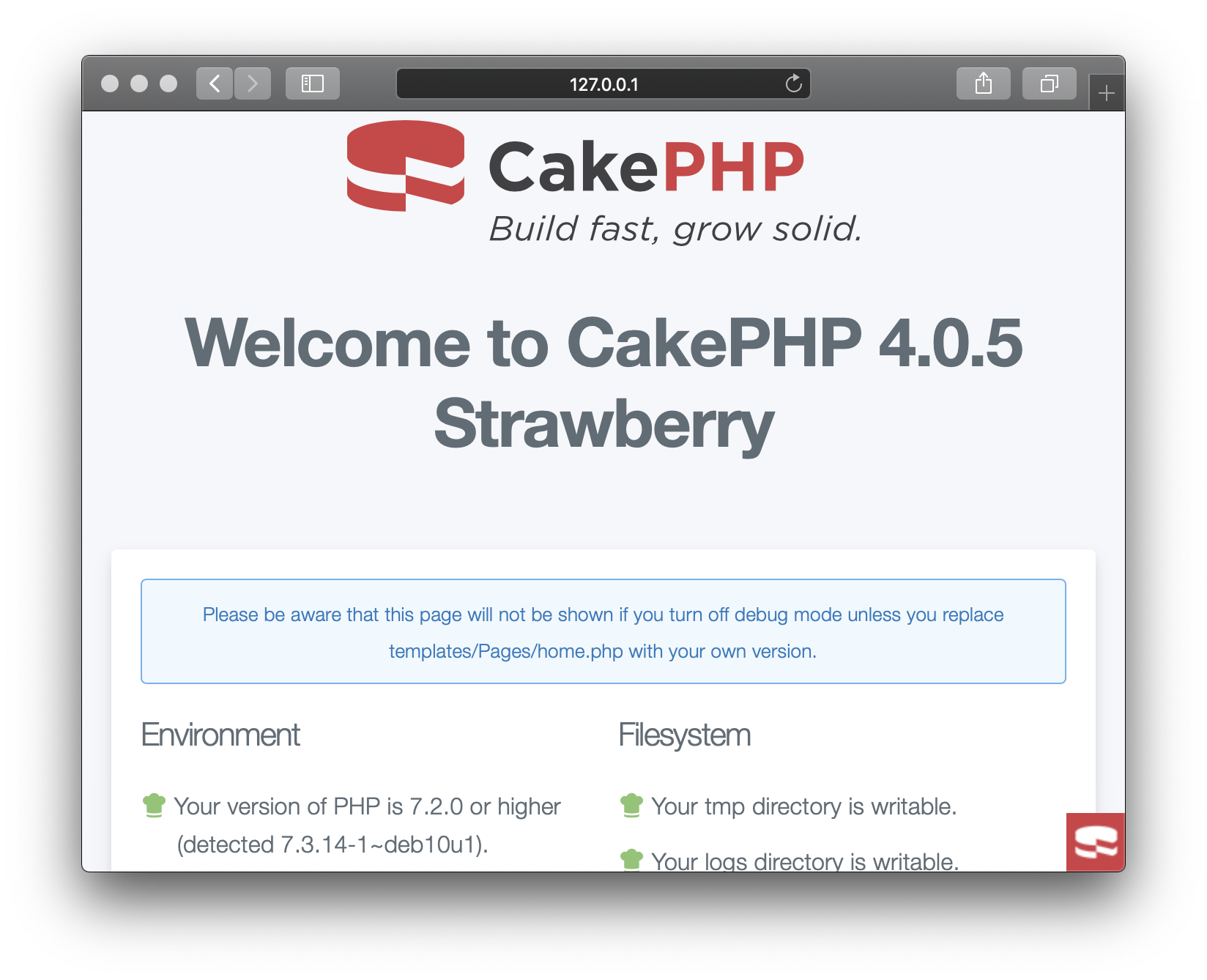 Install CakePHP and create or deploy your app. Here, we use CakePHP’s basic template and Composer: