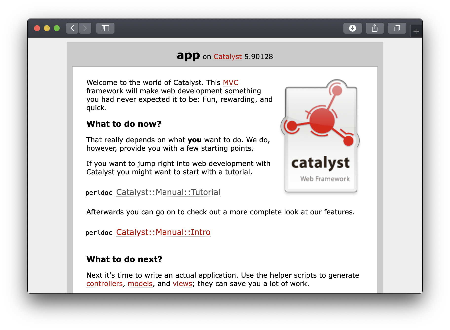 Create a Catalyst app. Here, let’s store it at /path/to/app/: