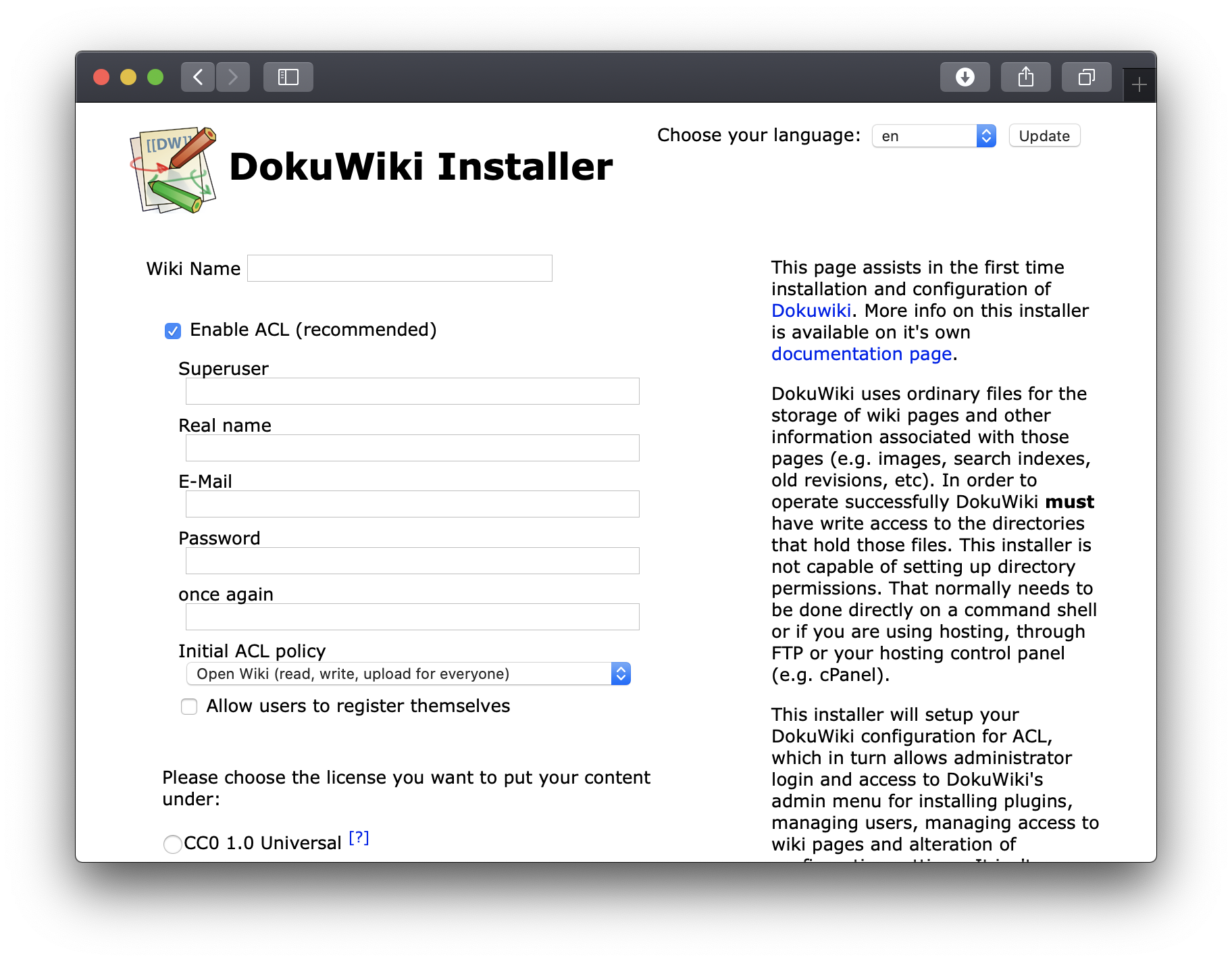Install DokuWiki’s core files. Here, we install it at /path/to/app/; use a real path in your configuration.