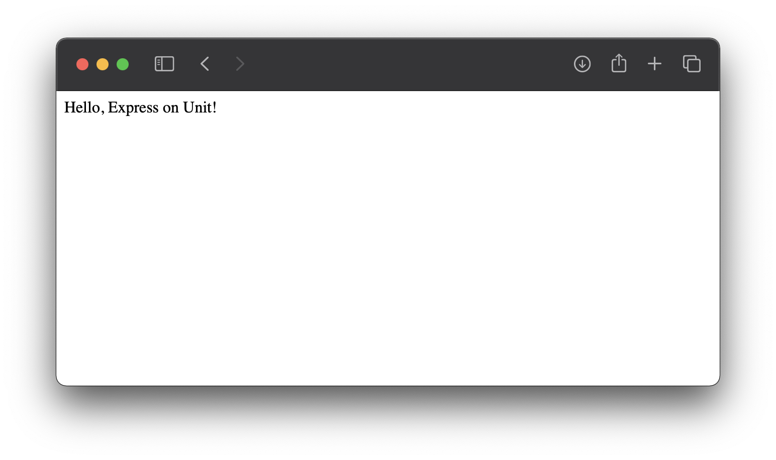 { "listeners": { "*:80": { "pass": "applications/express" } }, "applications": { "express": { "type": "external", "working_directory": "/path/to/app/", "executable": "/usr/bin/env", "arguments": [ "node", "--loader", "unit-http/loader.mjs", "--require", "unit-http/loader", "app.js" ] } } }