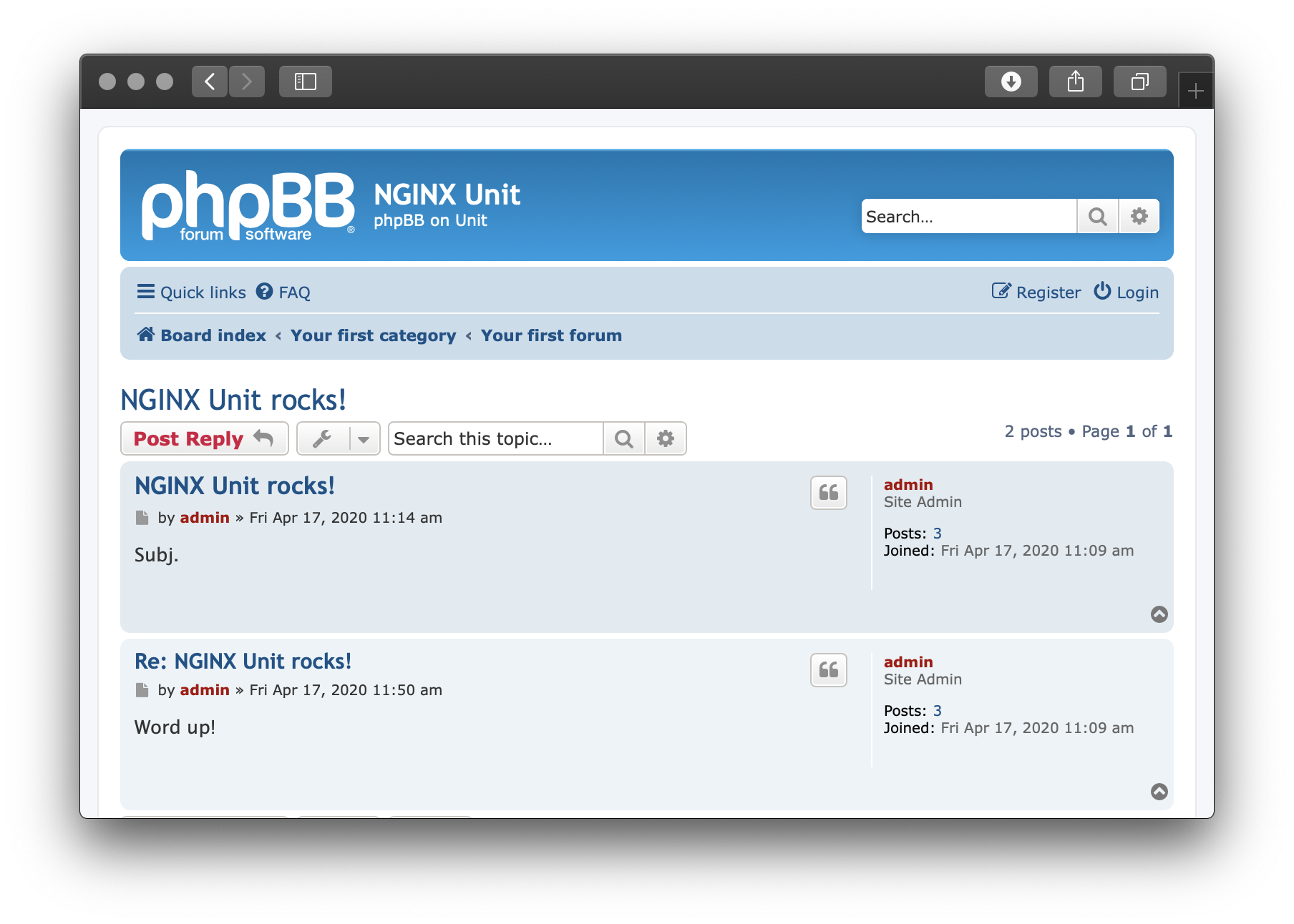 Install phpBB’s core files. Here, we install it at /path/to/app/; use a real path in your configuration.