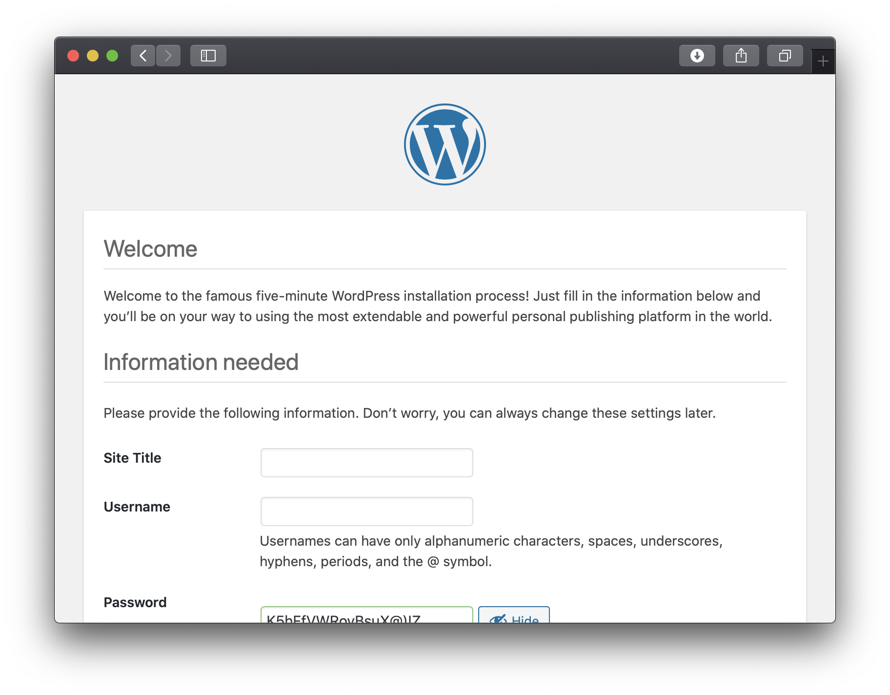 After a successful update, browse to http://localhost and set up your WordPress installation: